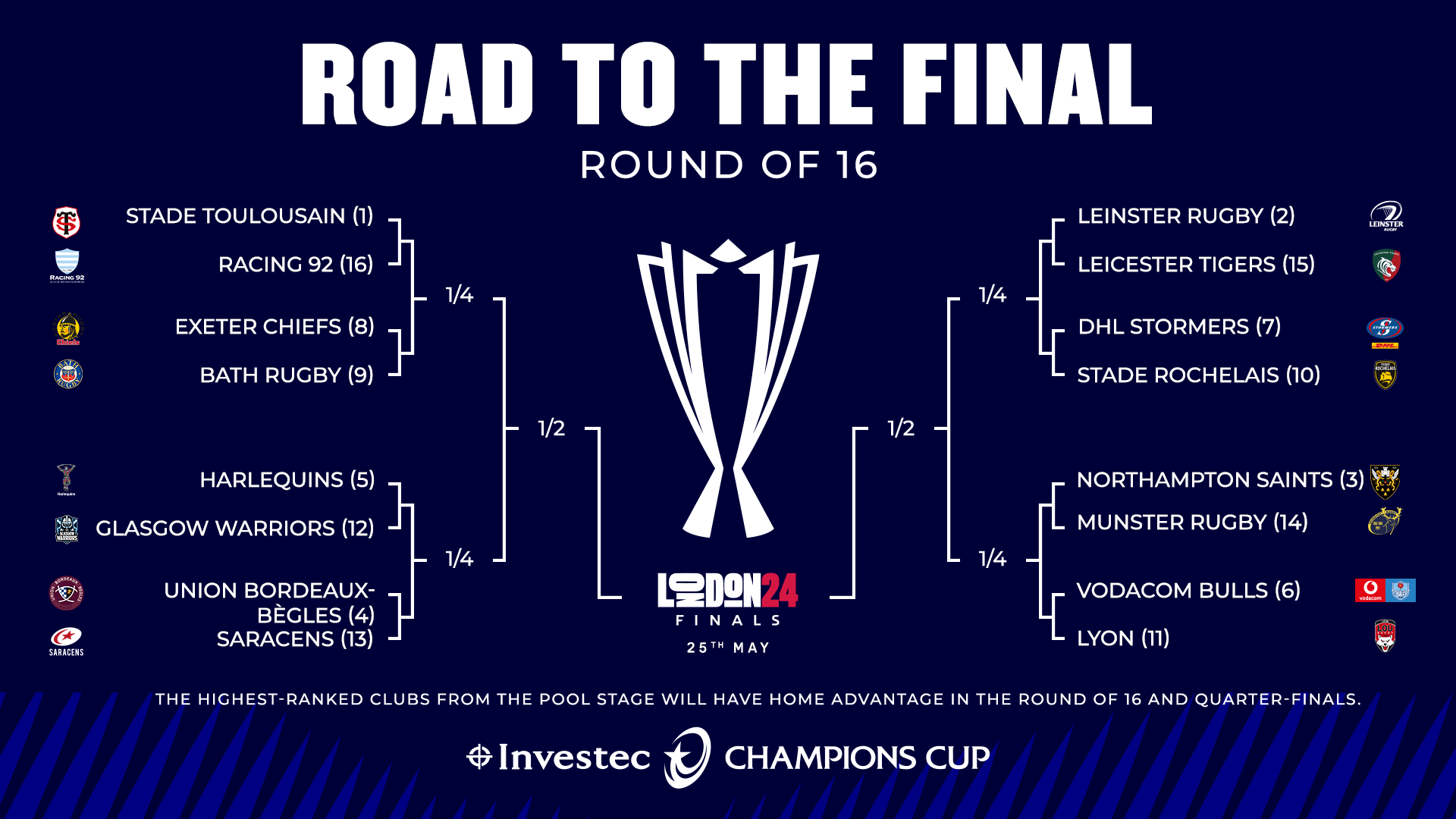 The Finals of both competitions will be hosted at Tottenham Hotspur Stadium in London on Friday 24 May (EPCR Challenge Cup) and Saturday 25 May (Investec Champions Cup), with the quarter-finals scheduled for the weekend of 12/13/14 April, and the semi-finals on the weekend of 3/4/5 May.