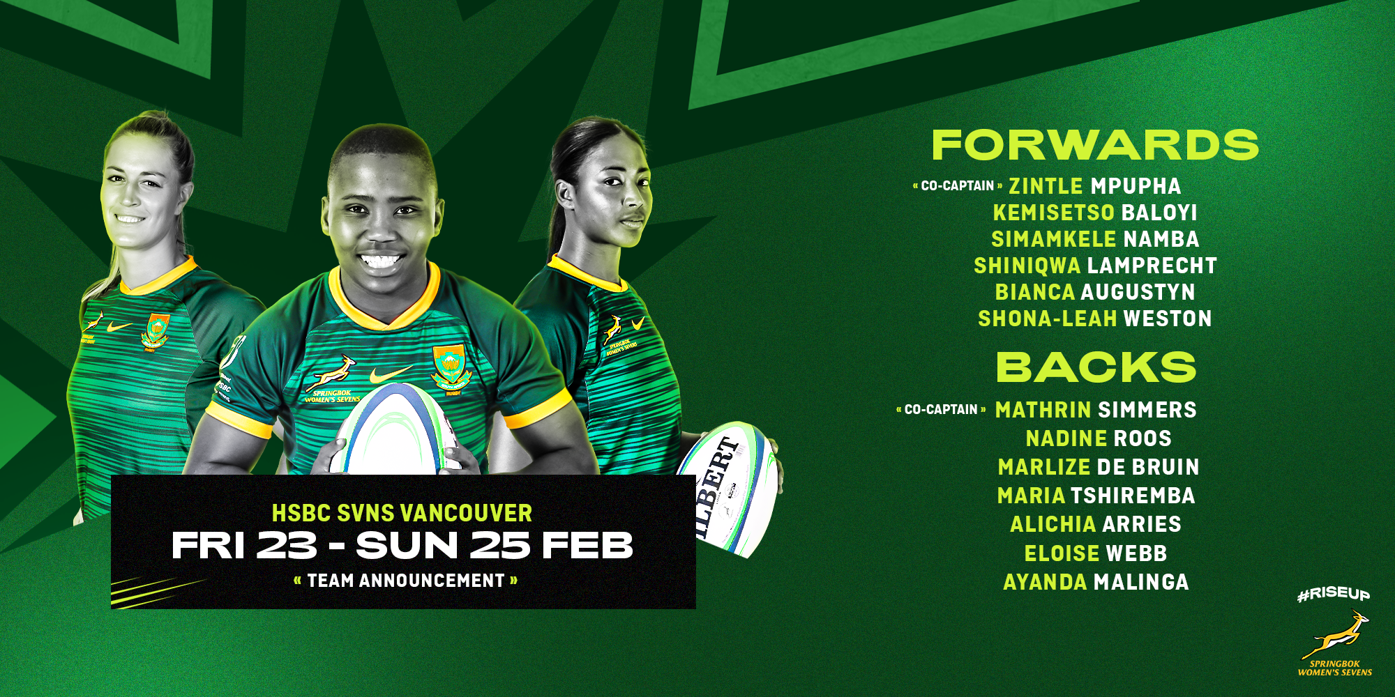 Backs: Lukhanyo Am (Hollywoodbets Sharks), Kurt-Lee Arendse (Vodacom Bulls), Faf de Klerk (Canon Eagles), Sacha Feinberg-Mngomezulu (DHL Stormers), Suleiman Hartzenberg (DHL Stormers), Jaden Hendrikse (Hollywoodbets Sharks), Jordan Hendrikse (Emirates Lions), Quan Horn (Emirates Lions), Herschel Jantjies (DHL Stormers), Jesse Kriel (Canon Eagles), Willie le Roux (Vodacom Bulls), Manie Libbok (DHL Stormers), Makazole Mapimpi (Hollywoodbets Sharks), Canan Moodie (Vodacom Bulls), Sanele Nohamba (Emirates Lions), Morne van den Berg (Emirates Lions), Henco van Wyk (Emirates Lions), Grant Williams (Hollywoodbets Sharks), Damian Willemse (DHL Stormers).
